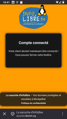 La procédure est la même qu'avec les autres clients, il faut entrer le nom du compte, l'adresse du serveur ( sacoche.libre34.org ) et le mot de passe, puis l'appli bascule sur le navigateur pour finaliser.