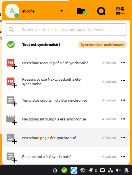 Un rond vert coché apparaît dans la barre d'outils, qui permet d'ouvrir la fenêtre Nextcloud.