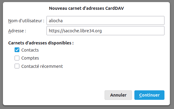 Puis choisir quels carnets d'adresses on veut synchroniser. Le carnet "Comptes" contient les contacts des autres adhérents de l'asso. Ne pas cocher "Contacté récemment".