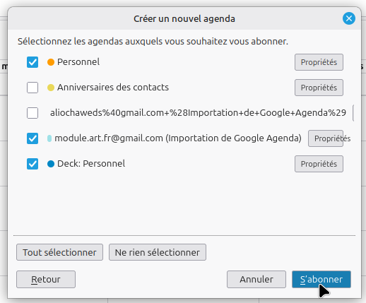 Il faut ensuite, comme avec Thunderbird, choisir quels agendas et carnets d'adresses seront synchronisés.