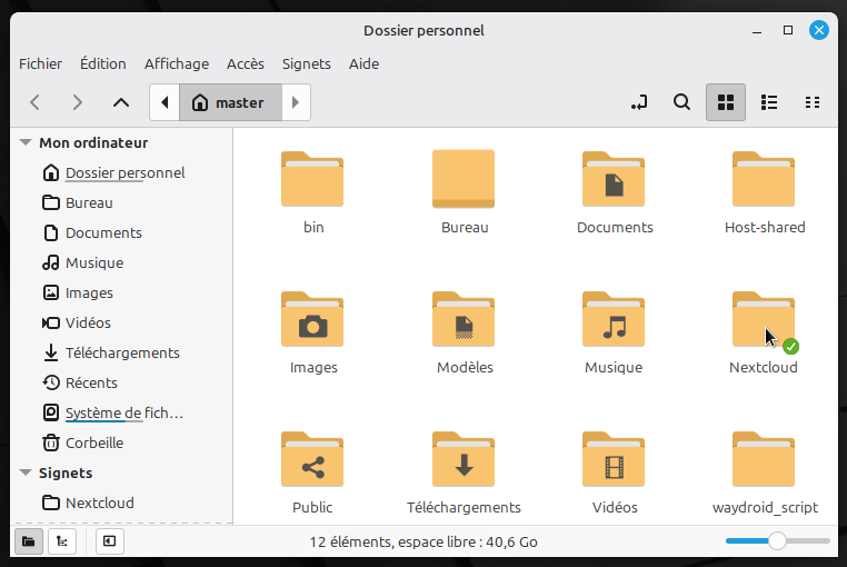 Il y a maintenant, dans le dossier personnel, un dossier Nextcloud marqué d’une pastille verte indiquant qu’il est bien synchronisé au serveur.