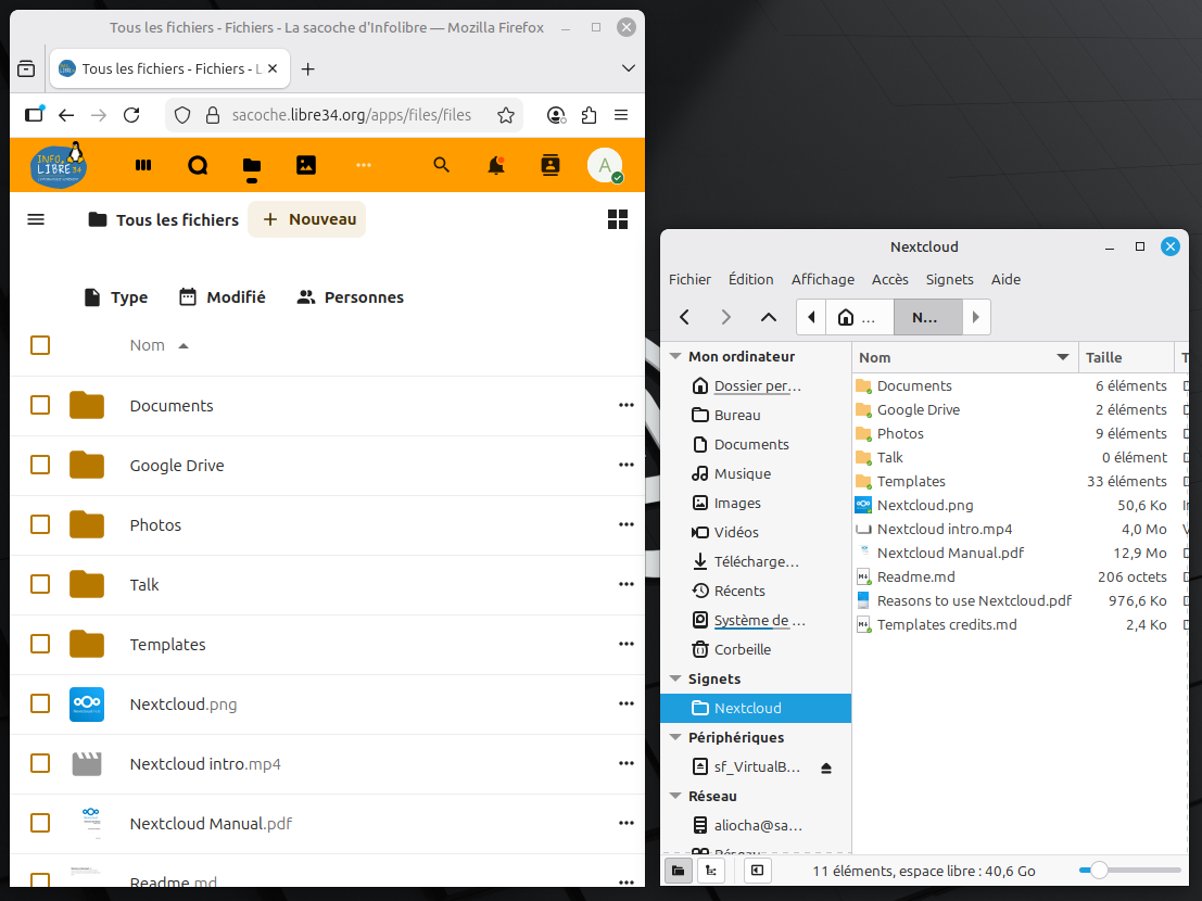 La différence, c’est que Nextcloud est souvent un outil interne à une petite organisation qui le gère comme elle veut. Dans le cas d’Infolibre34, l’espace Nextcloud est réservé aux adhérents et permet de faire plein de choses qui vont être expliquées dans cette documentation.
