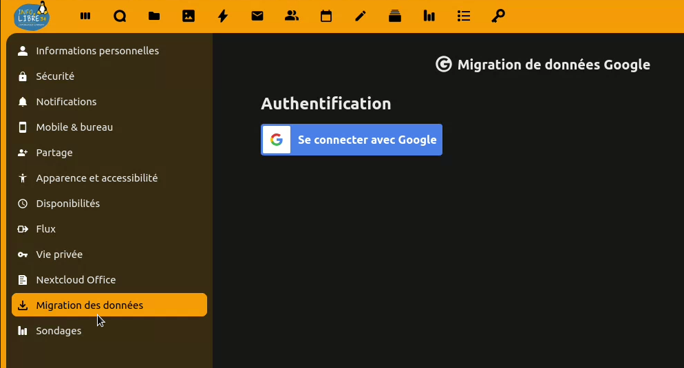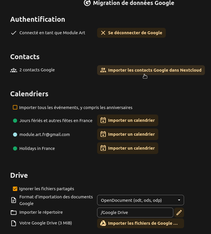 Sur l’instance Nextcloud d’Infolibre34, il y a un outil qui permet de faciliter la migration des données depuis Google drive, contact et agenda.