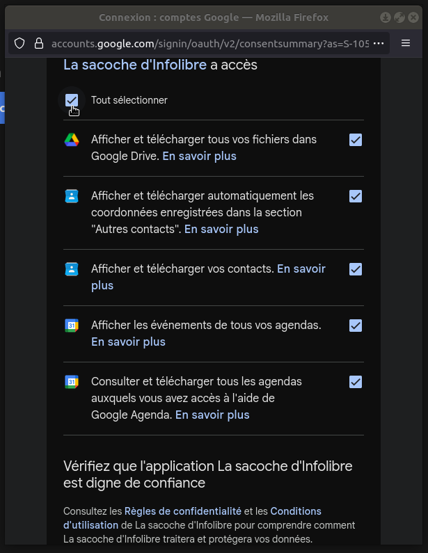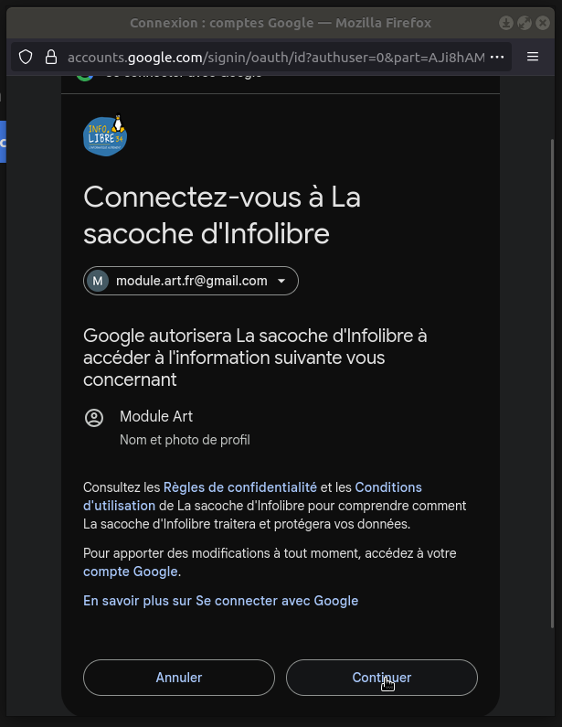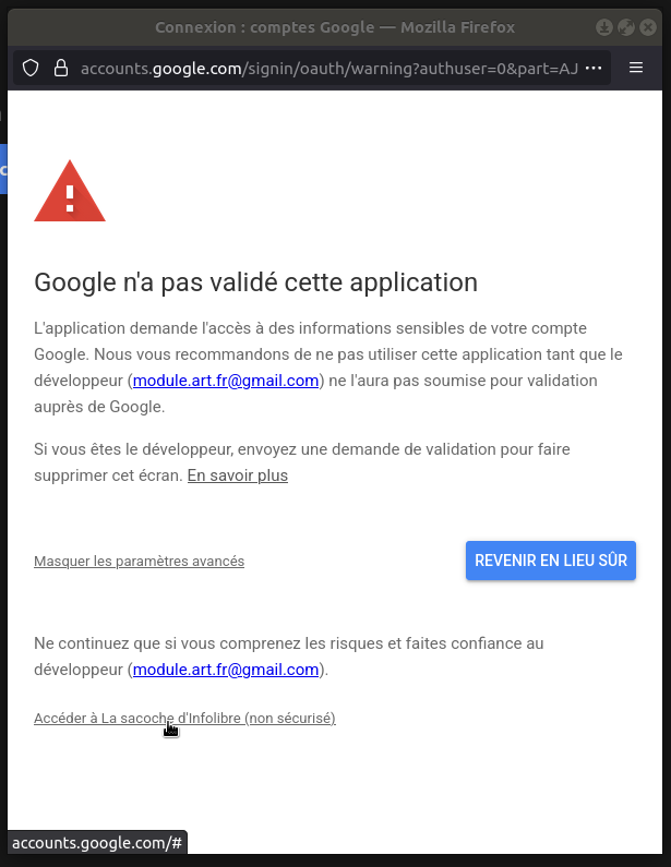 Lorsqu'on clique sur "Se connecter avec Google", un message inquiétant apparaît. En vérité, j'ai bien fait les démarches pour que la sacoche d'infolibre34 soit validée, et Google m'a répondu que c'était bon, mais le message s'affiche toujours. Y aurait-il de la part de Google un peu de réticence à faciliter la migration vers d'autres services ? On se le demande ?