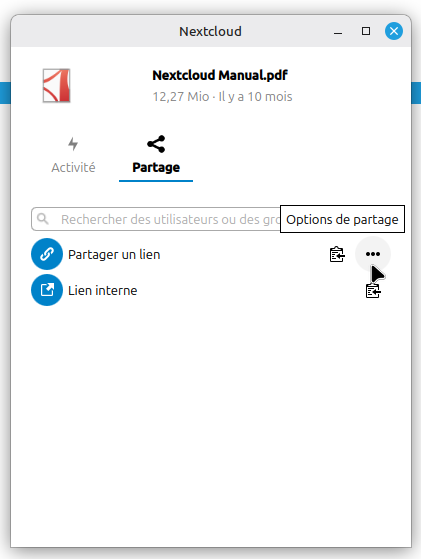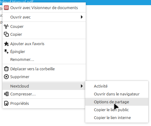 Le petit bonus est que maintenant, on peut gérer le partage en ligne des documents directement depuis l’ordinateur. Imaginons que je veux envoyer le mode d’emploi de Nextcloud à plein de gens. Je fais un clic droit sur ce fichier puis je choisis l’option Nextcloud puis "Options de partage".