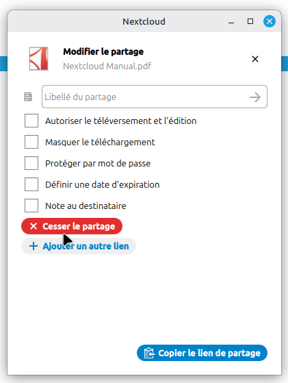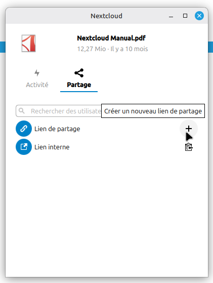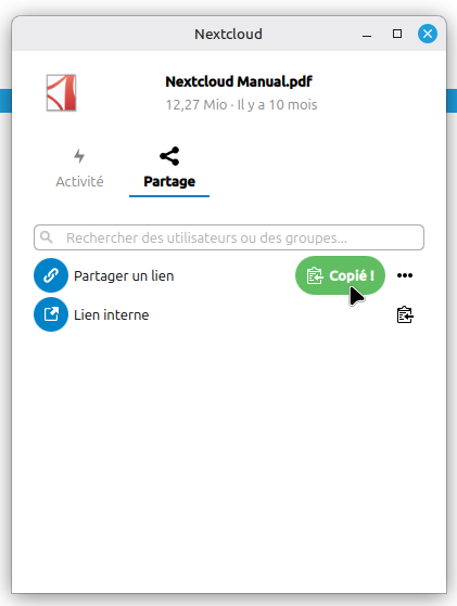 Un clic sur le + crée un lien public qui est aussitôt copié dans le presse papier.
